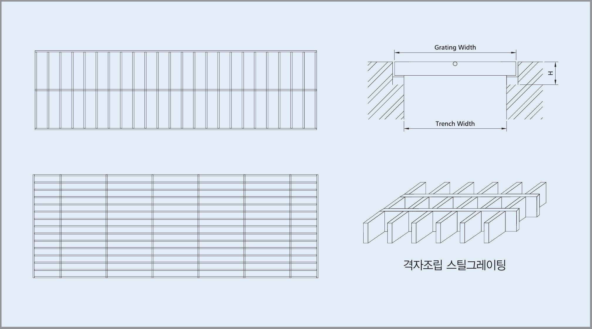 스테인레스304 판재와평철을 사용하여 그레이팅으로 제작한 제품으로 더울 견고하고, 식당 등 위생이 요구되는 곳이나 공장 및 학교, 회사의 작업장 등의 녹발생 억제가 요구되는 곳에서 사용하는 제품입니다.